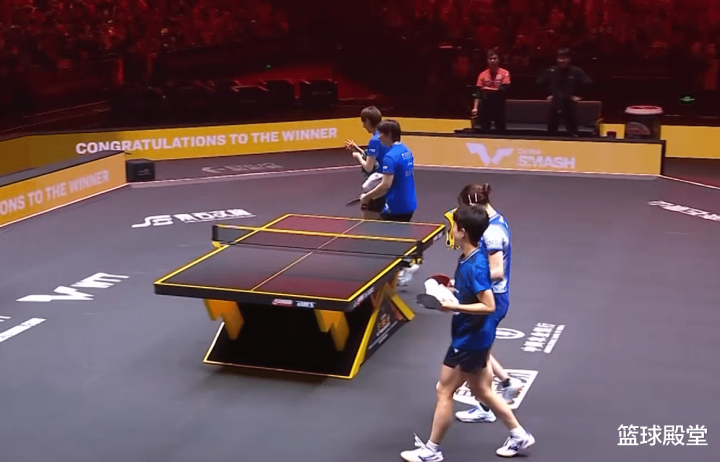 第三局开局还是有点劣势,1-3落后。中后局,王曼昱/蒯曼还保持了4-8落后。幸好最后时刻王曼昱/蒯曼打出了一个漂亮的相持,7-9打停对手。暂停回来,蒯曼接发失误,导致7-10落后。此时通过一个摆短和劈长,外加一个相持,追到10平。来到11平,打三角度得分,还能护台,13-11再下一局。